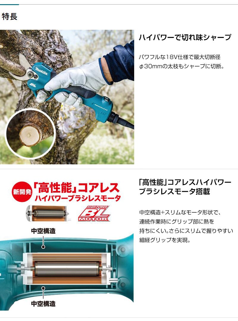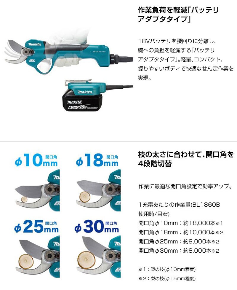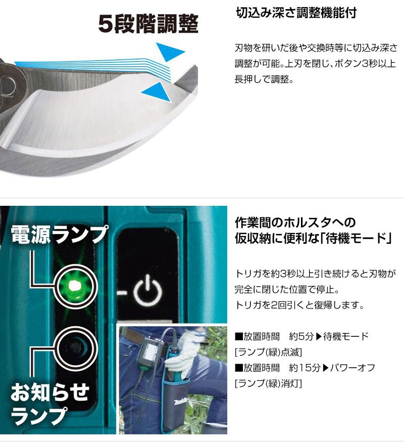 【軽量 コンパクト 握りやすい 作業負荷軽減 太枝 切断 梨の枝 せん定 高性能 細経グリップ 4段階切替 深さ調整 5段階 ホルスタ マックパックタイプ ケース付 充電式 コードレス 工具 電動工具 DIY ツール 工具 用品 makita 純正品】