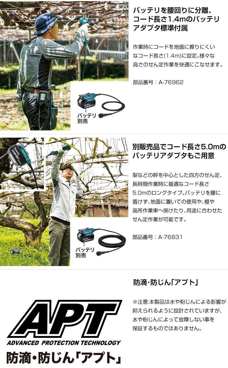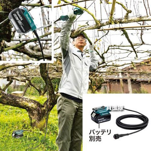 【別販売品でコード長さ5.0mのバッテリアダプタもご用意】梨などの幹を中心とした四方のせん定、長時間作業時に最適なコード長さ5.0mのロングタイプ。バッテリを腰に着けず、地面に置いての使用や、棚や高所作業車へ掛けたり、用途に合わせたせん定作業が可能です。