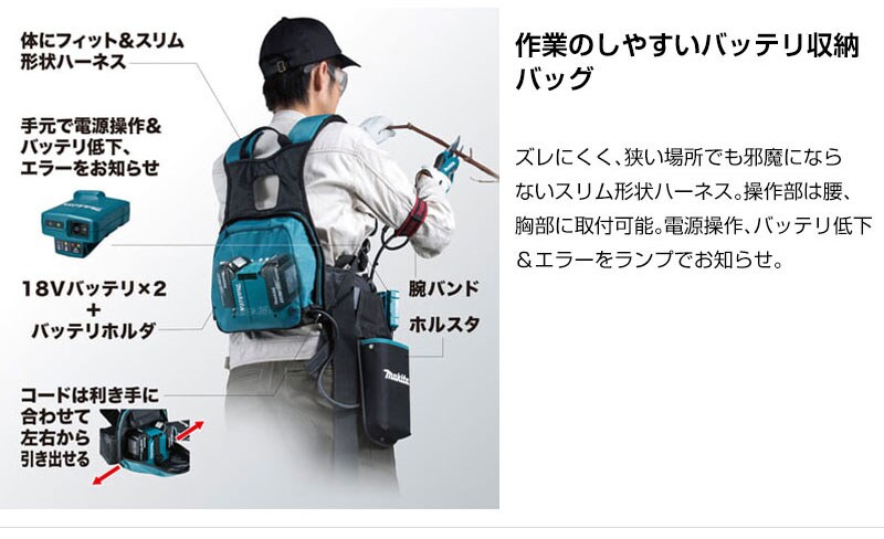 【作業のしやすいバッテリ収納バッグ】ズレにくく、狭い場所でも邪魔にならないスリム形状ハーネス。操作部は腰、胸部に取付可能。電源操作、バッテリ低下&エラーをランプでお知らせ。