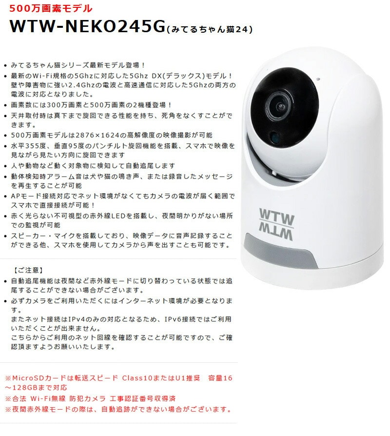 塚本無線 見守りカメラ みてるちゃん猫24 スマートカメラ 500万画素 WTW-NEKO245G 【ペットカメラ ホームカメラ スマホで見れる スマホ対応 遠隔操作 ズーム機能 子ども 子供 撮影 録画 見守る 自動追跡 人型検知 簡単】【おしゃれ おすすめ】
