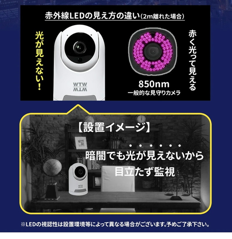 赤く光らない不可視型の赤外線LEDを搭載し、夜間明かりがない場所での監視が可能