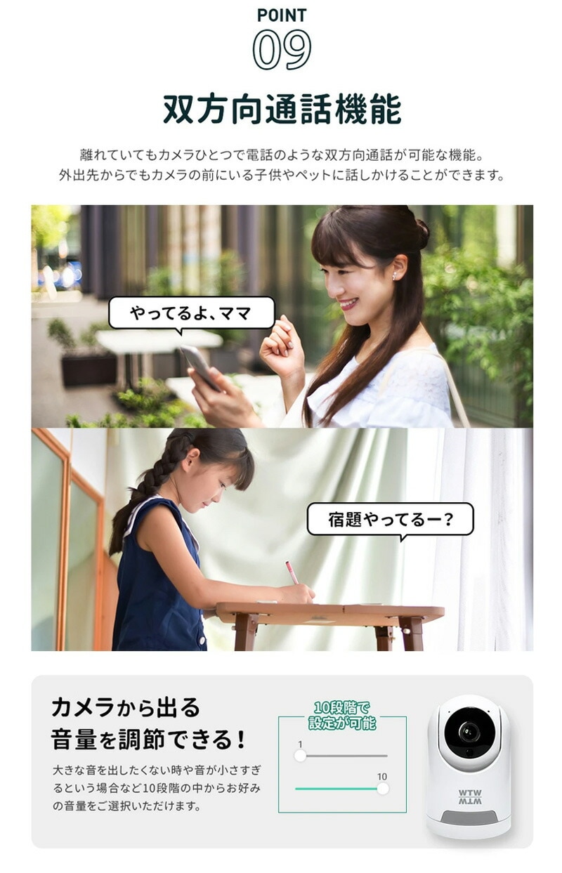 スピーカー・マイクを搭載しており、映像データに音声記録することができる他、スマホを使用してカメラから声を出すことも可能です。