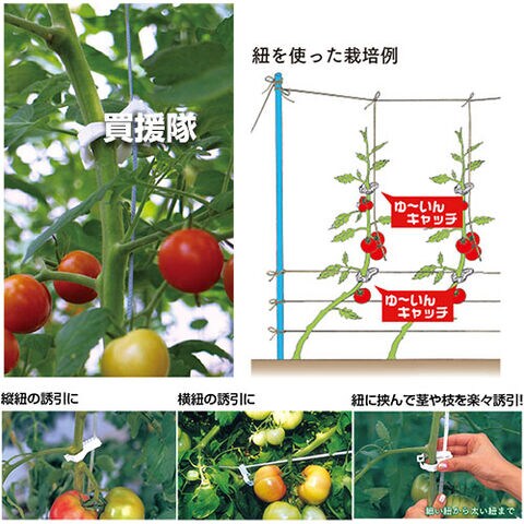細い紐から太い紐まで紐に挟んで茎や枝を楽々誘引!