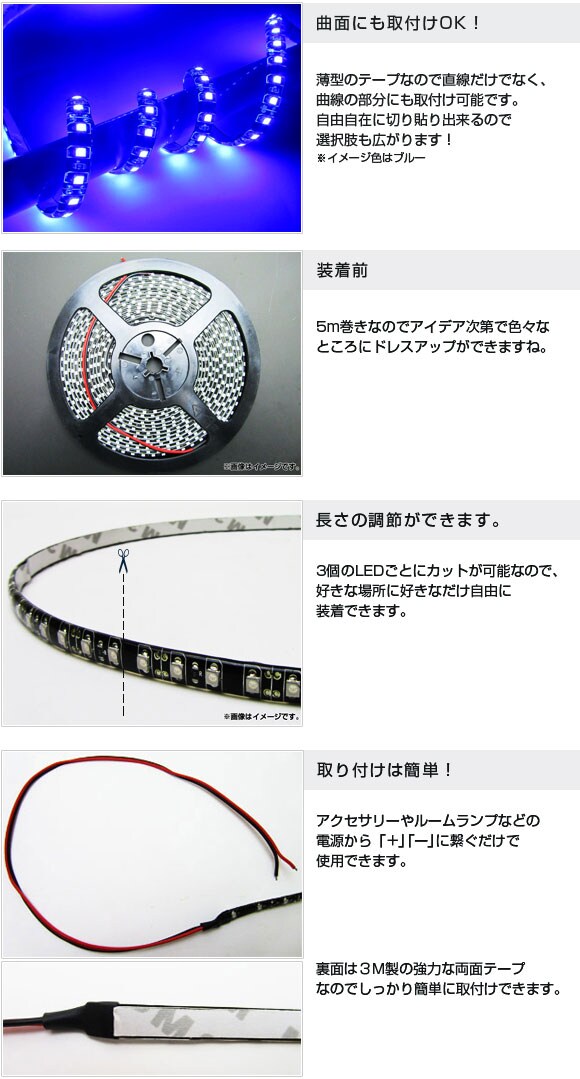 SMDテープ LEDラインテープ テープ型 高感度LED LEDテープライト 外装 内装 インテリア 電装パーツ ドレスアップ 青 BLUE 600連 600発 5メートル 5M 600B