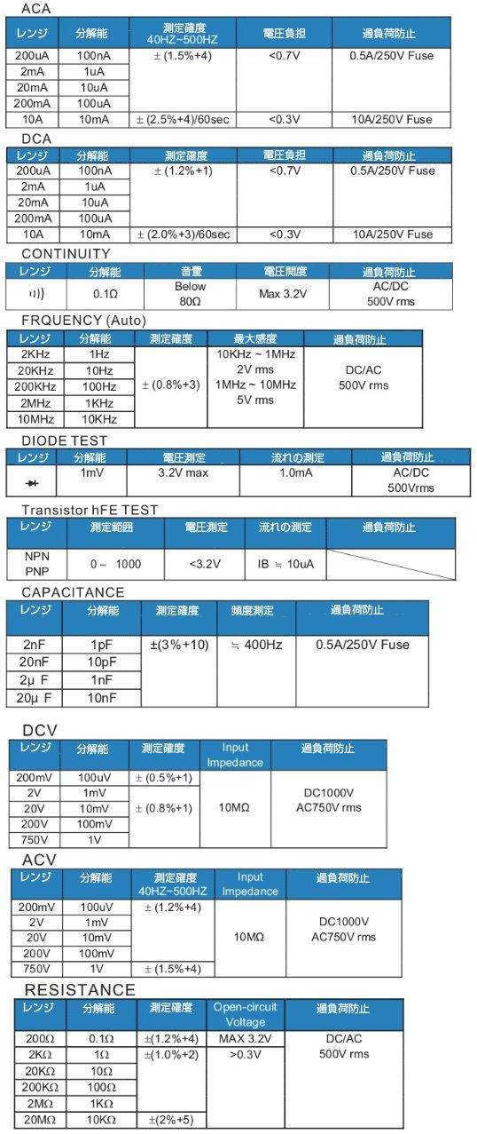 これ1台で電圧(直流・交流)、電流(直流)、ダイオードテスト、hFEテスト、抵抗テストが可能となっています。