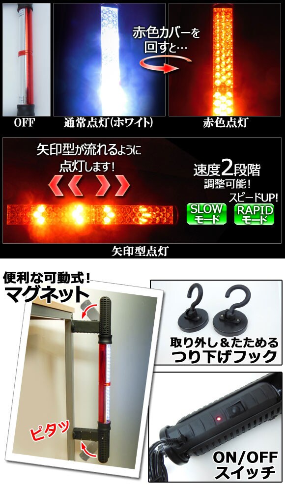 赤色カバーをかけたレッド、レッド点滅、レッド矢印点灯(遅)、レッド矢印点灯(速)の8種類がボタン一つで簡単操作!