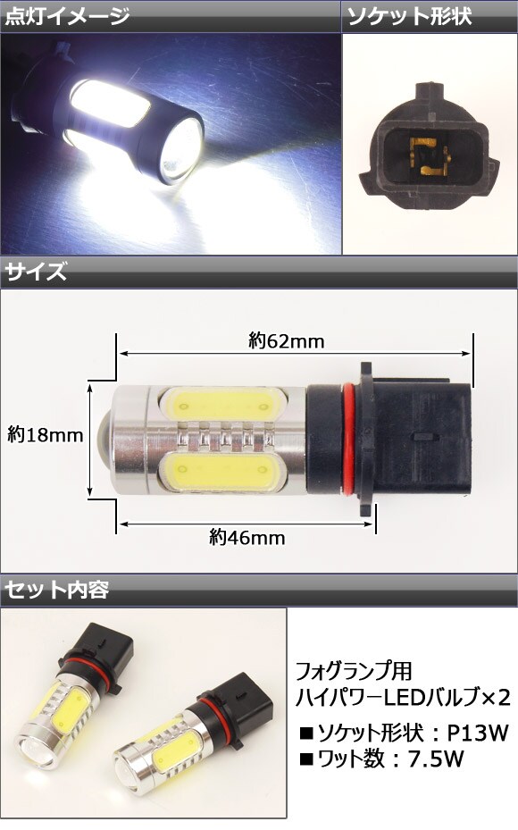 ハイパワー LEDバルブ ホワイト フォグランプ交換用 P13W 7.5W 入数:2個 APFOGP13W-7.5