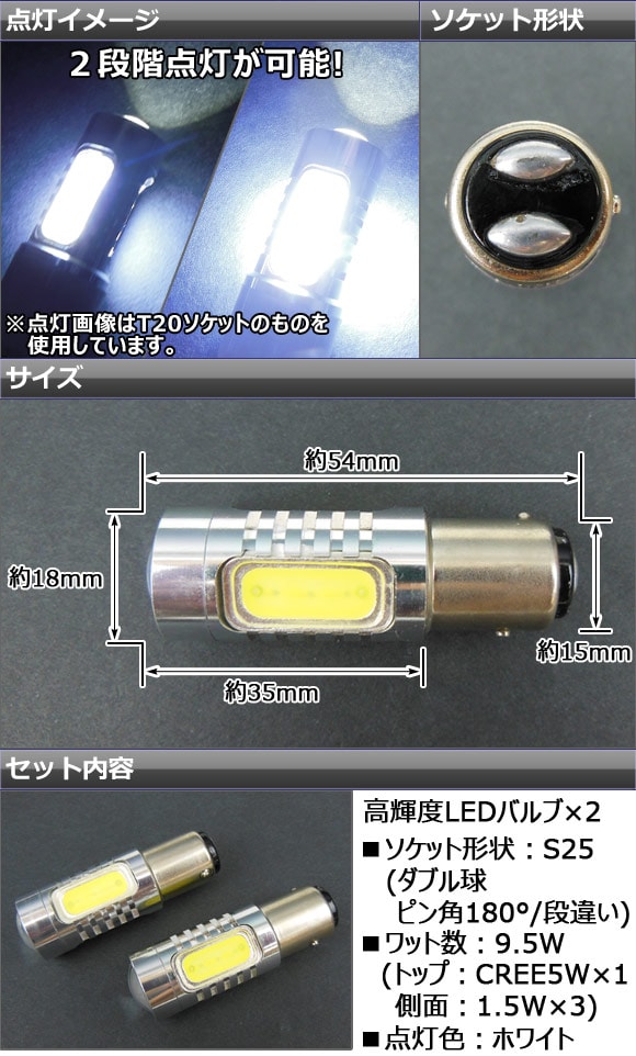 LEDバルブ ホワイト CREE製 高輝度チップ使用 アルミヒートシンク 9.5W 4面LED S25 口金球 ダブル 入数:2個 AP-HPS25-9.5W-4W-DBL