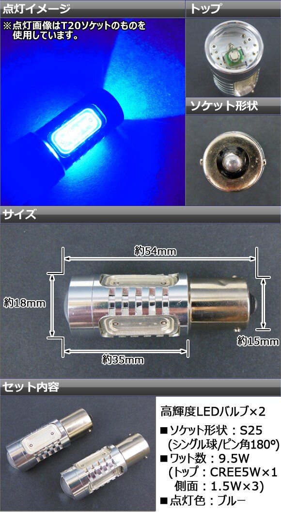 LEDバルブ ブルー CREE製 高輝度チップ使用 アルミヒートシンク 9.5W 4面LED S25 口金球 シングル 入数:2個 AP-HPS25-9.5W-4B-SNG