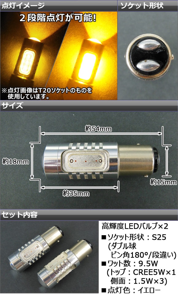 LEDバルブ イエロー CREE製 高輝度チップ使用 アルミヒートシンク 9.5W 4面LED S25 口金球 ダブル 入数:2個 AP-HPS25-9.5W-4Y-DBL