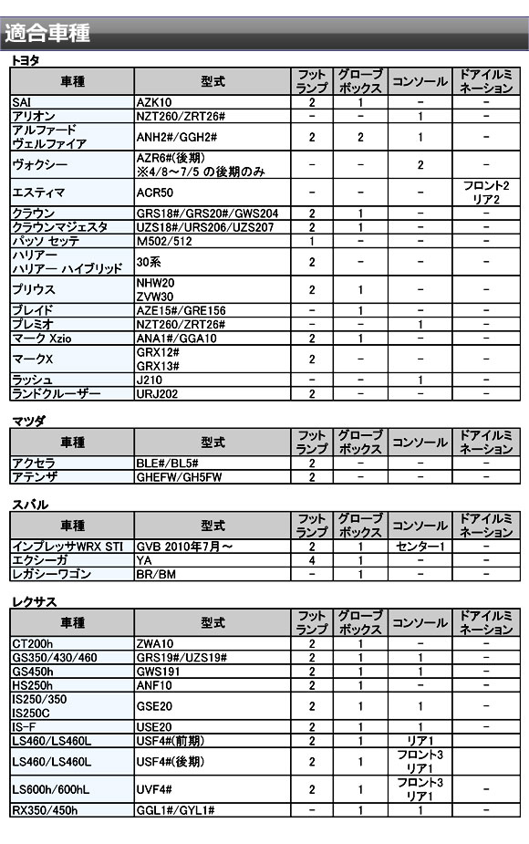 インナーランプ フットランプ LEDインナーランプ グローブボックス コンソール ドアイルミ ドアイルミネーション イルミネーション コンソールイルミネーションランプ ルームアンダーLED 室内LED 足元LED LED 汎用ランプ 純正交換用 ホワイト WHITE ブルー BLUE レッド RED パープル PURPLE グリーン GREEN ピンク 桃色 PINK トヨタ TOYOTA SAI アリオン アルファード ヴェルファイア ヴォクシー エスティマ クラウン マジェスタ パッソ セッテ ハリアー ブレイド プレミオ マークX プリウス ラッシュ ランドクルーザー スバル 富士重工 SUBARU インプレッサ レガシィ エクシーガ マツダ MAZDA アクセラ アテンザ レクサス LEXUS CT200h GS350 GS430 GS460 GS450h HS250h IS250 IS350 IS250C IS-F LS460 LS460L LS600h LS600hL RX350 RX450h