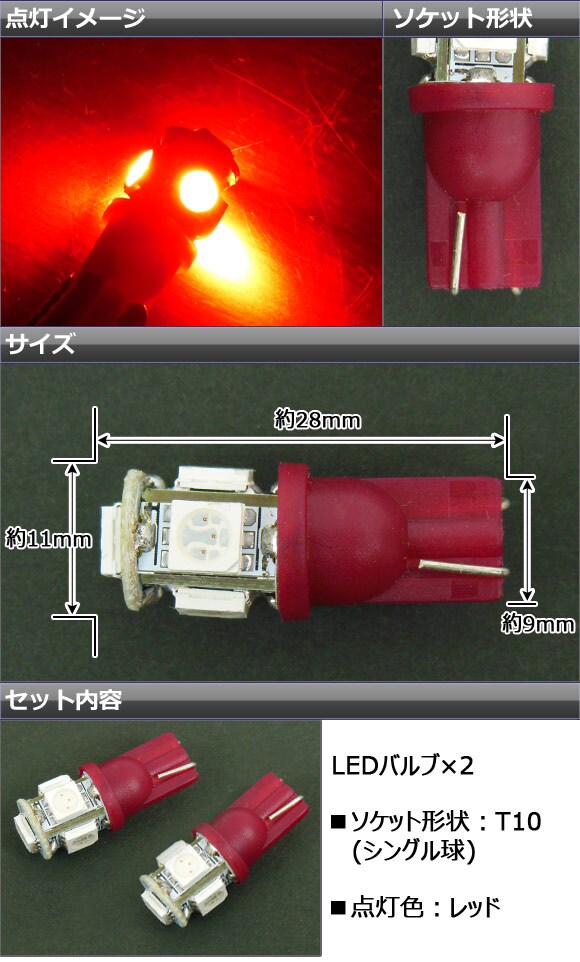 3チップ SMD LEDバルブ レッド シングル球 T10 5連 入数:2個 AP-T10-5SMD-5050-RD