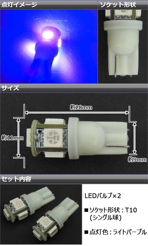 3チップ SMD LEDバルブ ライトパープル シングル球 T10 5連 入数:2個 AP-T10-5SMD-5050-LP