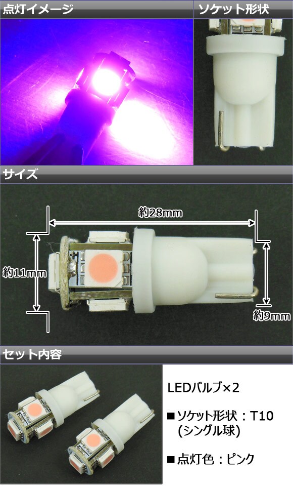 LED バルブ ライト ランプ 照明 電球 3chip 5灯 5発 汎用 シングル 5050 ウェッジ ウエッジ ウェッジ球 ウエッジ球 発光 ポジション ナンバー ルーム ラゲッジ バニティ ドアカーテシ ライセンス 桃色 PINK automobile motorcar オートモービル モーターカー カー 車 自動車 車両