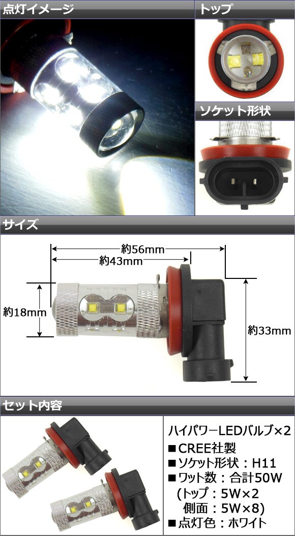 ハイパワー LEDバルブ ホワイト CREE製 XB-Dチップ10個使用 50W H11 平型ヘッドアルミ 入数:2個 AP-HPH11-50WC-10W