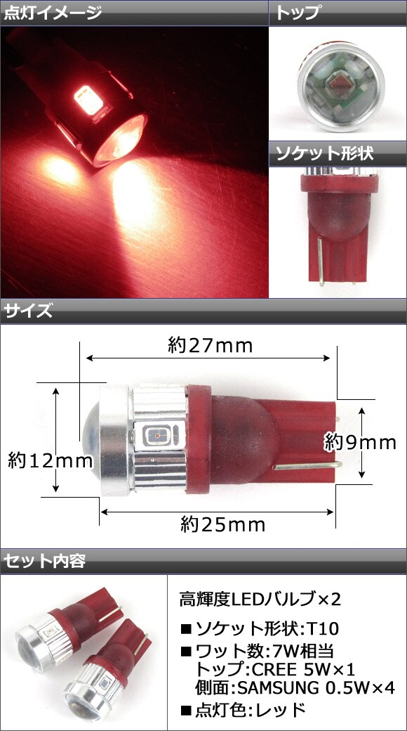 高効率LEDバルブ レッド CREE製/SAMSUNG製チップ採用 5連 7W相当 T10ウェッジ 入数:2個 AP-HPT10-7W-5R