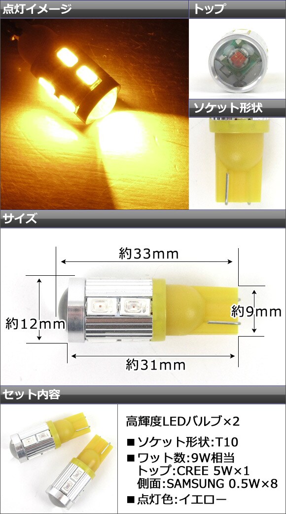 高効率LEDバルブ イエロー CREE製/SAMSUNG製チップ採用 9連 9W相当 T10ウェッジ 入数:2個 AP-HPT10-9W-9Y