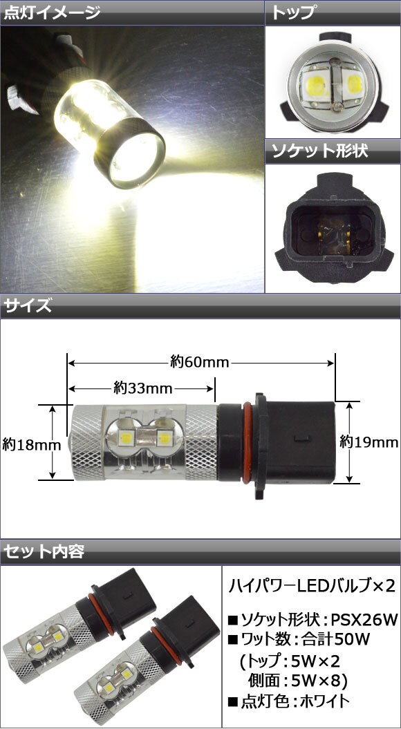 ハイパワー LEDバルブ ホワイト CREE製 LEDチップ10個使用 50W PSX26W 入数:2個 AP-PSX26W-50W-CREE