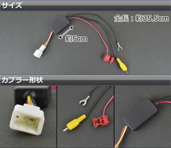 トヨタ純正、ホンダ純正、ダイハツ純正、イクリプス(AVN系)いずれもディーラーオプションナビゲーション付属のバックカメラを新しく購入したパナソニックやパイオニアなど社外品のナビに接続可能にする、電源出力付変換アダプター業務用になります。