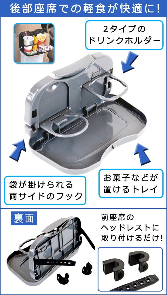 前座席のヘッドレストに簡単に取り付けができ、使いたいときに開くだけでドリンクホルダーとお菓子などが置けるトレイが登場します。