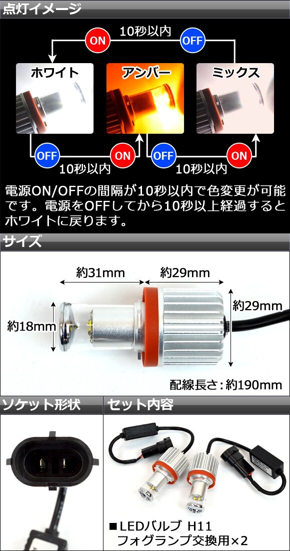 LEDバルブ フォグランプ交換用 ダブルカラー H11 10W アルミヒートシンク付き 入数:1セット(左右) AP-HPH11-10W-2Y-W
