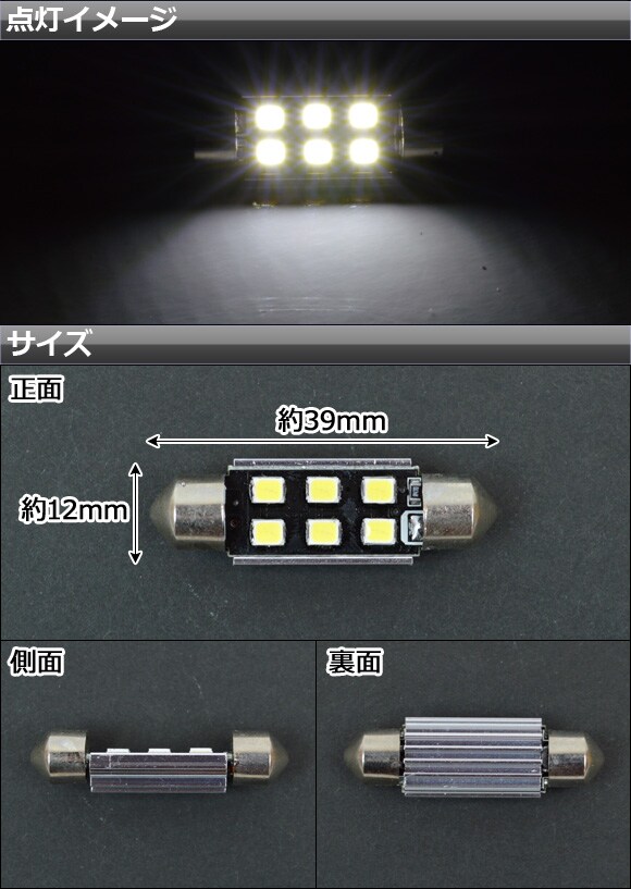 ルームランプ ルームライト 車内灯 室内灯 T10 39ミリ T10×39 39 39mm 6個 6灯 6発 汎用 LED ヒューズ球 タル型 樽型 両口金 まくら球 枕球 枕型球 枕型 CREE 3535 バルブ 白 white ホワイト 電球 発光 ライト ランプ 照明 センター マップ バニティ バニテイ バイザー カーテシ フット ラゲッジ トランク フロント ルーム キャンセラー カンバス CANBUS 4.5W 4.5ワット 270LM 270ルーメン 12ボルト automobile motorcar オートモービル モーターカー カー 車 自動車 車両 キャンバス