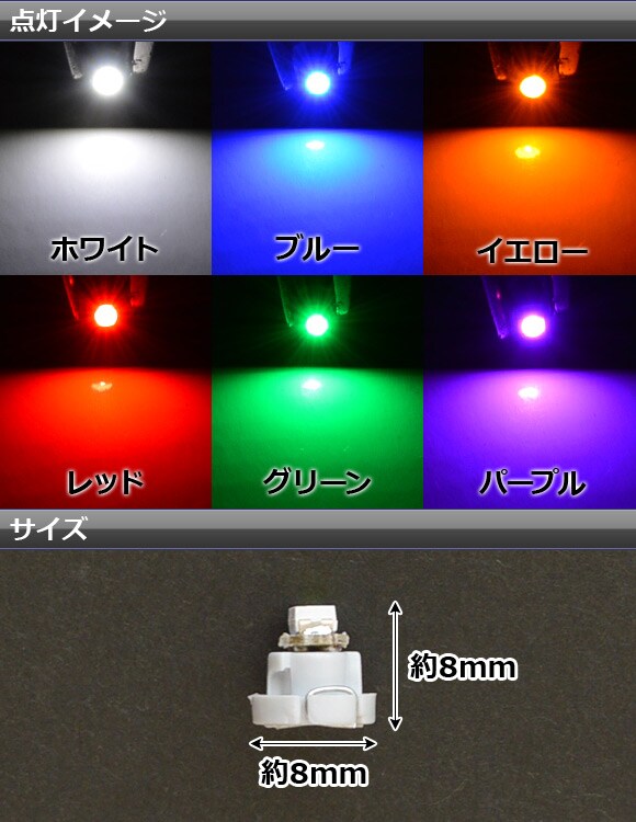 ホワイト AP-LED-T3-1SMD-WH ブルー AP-LED-T3-1SMD-BL イエロー AP-LED-T3-1SMD-YE レッド AP-LED-T3-1SMD-RD グリーン AP-LED-T3-1SMD-GR パープル AP-LED-T3-1SMD-PU 4562430340836 4562430340843 4562430340850 4562430340867 4562430340874 4562430340881 LED バルブ エアコンパネル エアコン タコメーター メーター インジケーター シガーライター スイッチ インパネ ダッシュボード 灰皿 1発 1灯 1個 12V 12ボルト ミニベース ウェッジベース ウエッジベース ウェッジ ウエッジ ウェッジ球 ウエッジ球 白 青 黄色 黄 アンバー 赤 緑 ランプ ライト 照明 電球 電灯 発光 広角 広範囲 automobile motorcar オートモービル モーターカー カー 車 自動車 車両