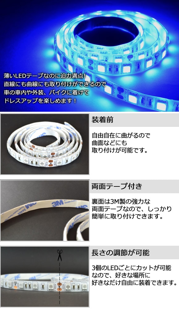 テープライト SMDテープライト LEDテープ SMDテープ ラインテープ テープ LED 高輝度LED テープ型 外装 内装 インテリア 電装パーツ ドレスアップ 1m 1メートル 100センチメートル 100CM イルミネーション 60SMD 60連 60灯 60発 発光 正面発光 5050チップ 防水 IP65 12V 白 青 橙 緑 WHITE BLUE WARMWHITE PINK ORANGE GREEN automobile motorcar オートモービル モーターカー カー 車 自動車 車両