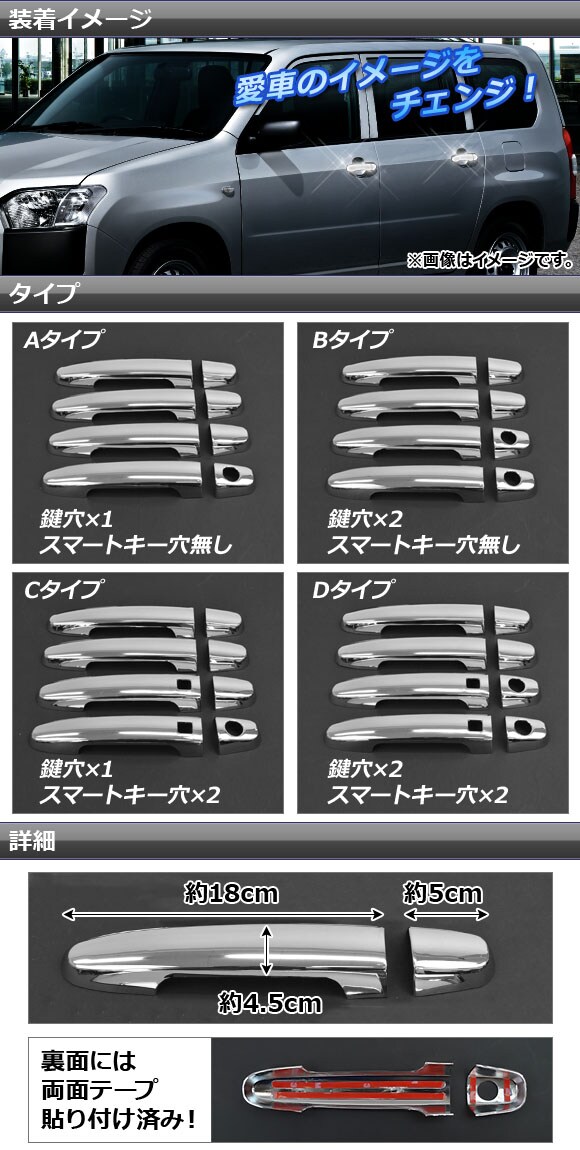 Aタイプ AP-DH01P8-A Bタイプ AP-DH01P8-B Cタイプ AP-DH01P8-C Dタイプ AP-DH01P8-D 4562430358015 4562430358022 4562430358039 4562430358046 トヨタ自動車 NCP50V NCP51V NCP52V NCP55V NLP51V NCP58G NCP59G ドアハンドルカバー ハンドルカバー カバー ガード ドアノブカバー ドアノブ ハンドル メッキカバー 取っ手 ノブ PROBOX プロボックス バン ガーニッシュ 外装 ドレスアップ エクステリア メッキ パーツ 銀 クローム シルバー chrome silver automobile motorcar オートモービル モーターカー カー 車 自動車 車両