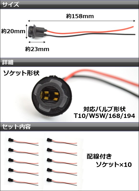 配線付ウェッジソケット T10,W5W,168,194 AP-AD-W5W 入数:1セット(10個)