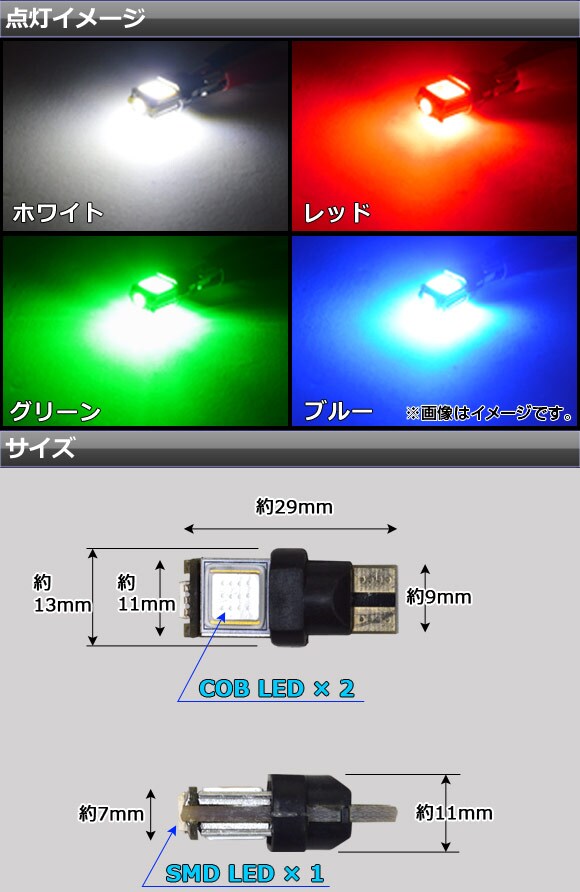 LEDバルブ T10 12V COB×2 SMD×1 選べる4カラー 入数:2個 AP-SMDCOB-A130