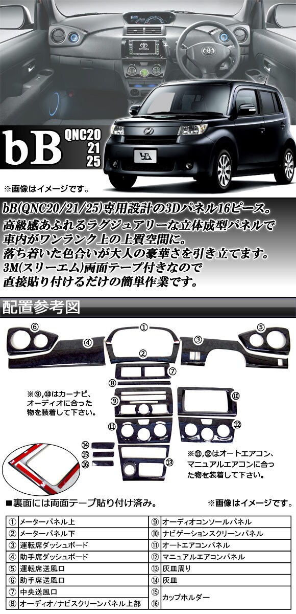 3Dインテリアパネル トヨタ bB QNC20/QNC21/QNC25 2005年12月~ 黒木目 入数:1セット(16個) AP-3DIP-KT39BB