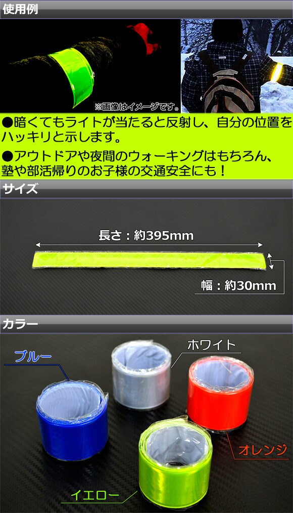 イエロー AP-AR003-YE ブルー AP-AR003-BL オレンジ AP-AR003-OR ホワイト AP-AR003-WH 4562430441793 4562430441809 4562430441816 4562430441823 反射ベルト 反射バンド 反射テープ 安全テープ 蛍光ベルト 安全ベルト 蛍光バンド ベルト テープ バンド アームバンド フィッシング ジギング 夜釣り 釣り 交通安全 ウォーキング 散歩 ランニング ジョギング サイクリング 自転車 ライディング バイク キャンプ 登山 アウトドア ランドセル 夜間 夕暮れ リスト 手首 足首 腕 夜道 巻き付き 39.5cm 3cm ミリ センチ 板バネ 反射格子 ゼンマイ 子供 通学 お年寄り 安全