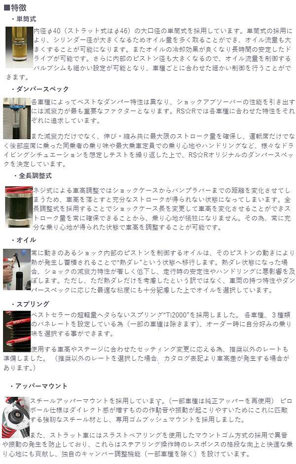 RS★R 株式会社ティエムシー アールエス・アール アールエスアール あーるえすあーる RSR RS☆R 車高調 車高調整式 ショックアブソーバー サスペンションパーツ サスペンションセット スプリング ショックアブソーバ キット セット KIT SHOCK ABSORBER ローダウン ダウンサス ドレスアップ パーツ 単筒式 モノチューブ ミドルタイプ 全長調整式 減衰力固定 Basic-i ベーシックアイ スタンダード