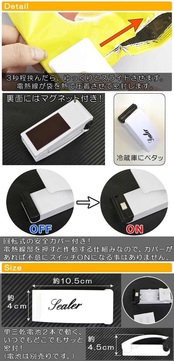 シーラー シーリングマシン クリップシーラー ポータブルシーラー フードシーラー ポケットシーラー 圧着 シーリング くっつける 閉じる 密封 保存 ジッパー 整理 収納 保管 食べ残し ポテトチップス ポテチ ポップコーン 閉める お菓子 スナック菓子 スナック おやつ ビニール ナイロン 袋 挟む スライド マグネット 調理ツール ツール 調理用 道具 キッチンアイテム キッチン 台所用品 台所 クッキング 雑貨 用具 ピクニック 外出 常備薬 ガーデニング 種 105 40 45 mm ミリ センチ