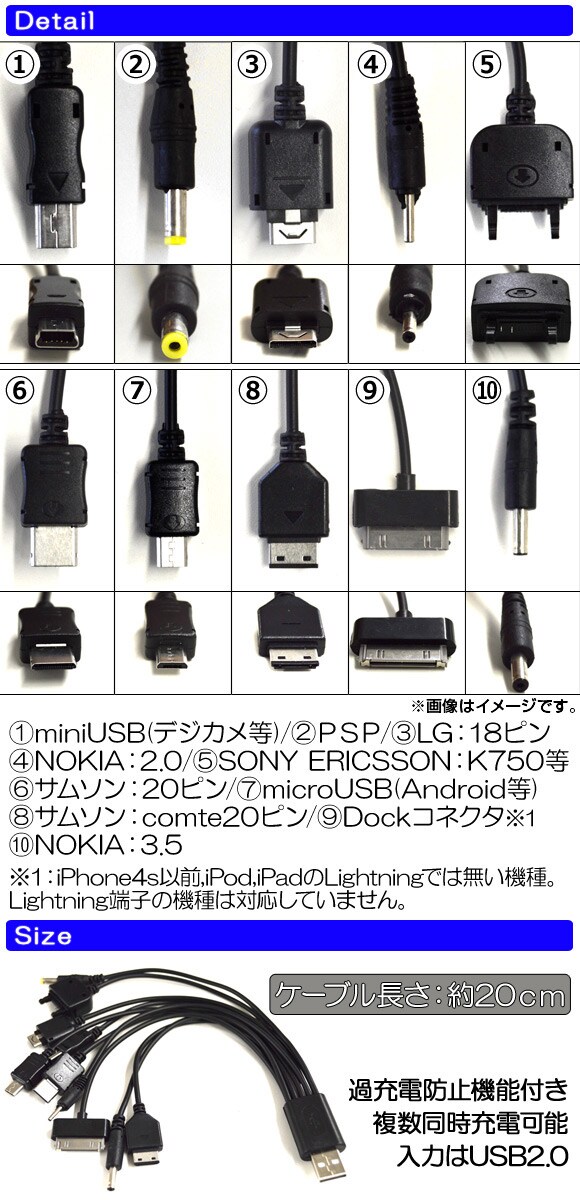 マルチUSB充電ケーブル 汎用 マルチコネクタ 10股 10種の端子に対応する超便利充電ケーブル! AP-TH060