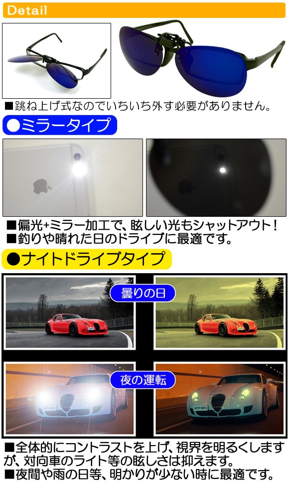 クリップオンサングラス 跳ね上げ式 ミラー 偏光 ナイト ティアドロップ 選べる7カラー AP-AR021