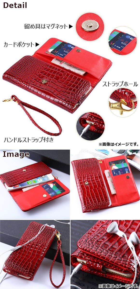 スマートフォン スマホケース スマホ スマホポーチ ポーチ ポーチ型 ケース カバー iPhone アイフォン アイホン 5 5s 6 6s 6プラス 6plus 6プラスs 6pluss SE スマフォ galaxy ギャラクシー S5 S6 S7 エクスペリア Xperia Z3c Z4 Z5 携帯 ドコモ エーユー ソフトバンク DoCoMo au Softbank ユニバーサル 全機種 エナメル 光沢 クロコダイル柄 クロコダイル crocodile ワニ ヘビ柄 snake ハンドルストラップ ストラップ付き 万能 ハンドストラップ 鰐 わに