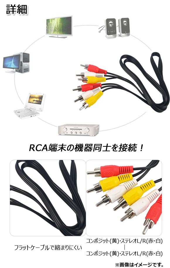 コンポジットケーブル AVケーブル 変換ケーブル 接続ケーブル アナログ オーディオ端子 分配ケーブル 分配 コンポジット映像信号 映像信号 アナログ音声信号 音声信号 ステレオ 音声 音楽 音 曲 ミュージック 機器 CD MD コンポ ポータブル スピーカー MP3 プレイヤー プレーヤー ウォークマン iPod スマートフォン スマホ スマフォ Android アンドロイド iPhone アイフォン BSチューナー DVDプレイヤー HDレコーダー テレビ TV PC パソコン 周辺機器 接続 MTR レコードプレイヤー 赤 白 黄色