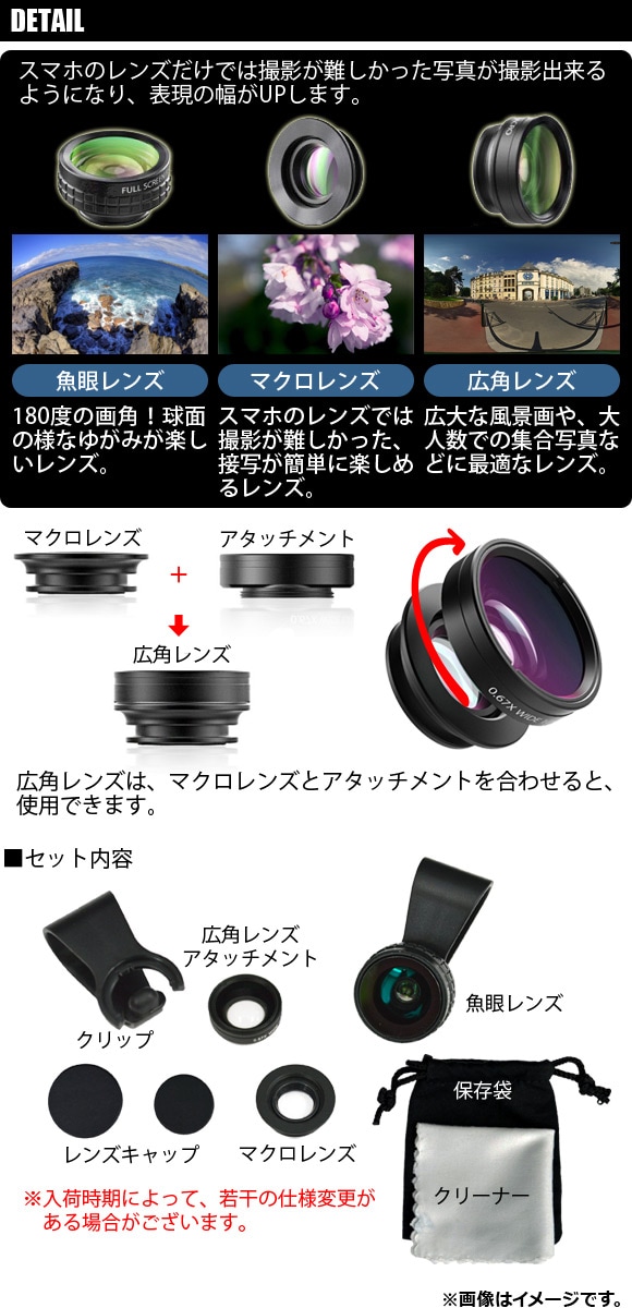 スマートフォン用レンズ カメラレンズ セルカレンズ スマホ用レンズ スマホカメラ スマホカメラレンズ スマホレンズ 魚眼レンズ マクロレンズ 広角レンズ 3in1レンズ クリップ式レンズ クリップレンズ カメラ レンズ 魚眼 マクロ 広角 3in1 クリップ スマートフォン スマホ タブレット 携帯電話 アップル Apple アイフォン iPhone アイパッド iPad アイポッド iPod アンドロイド Android エクスペリア Xperia ギャラクシー Galaxy アクオス AQUOS フィッシュアイ 180度 パノラマ ワイド 110度 接写 簡単 取付け 自撮り アタッチメント