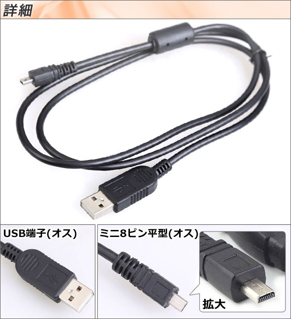 ケーブル カメラケーブル 接続ケーブル コネクタ コネクター アダプター アダプタ コード 配線 ハーネス 8pin ミニ 8ピン 平型 カメラ接続 カメラ 写真 デジカメ デジタルカメラ ビデオ 取り込み USB機器 USB 接続 データ転送 充電 チャージャー チャージ 電源 電池 バッテリ Nikon ニコン パナソニック Panasonic ソニー Sony OLYMPUS オリンパス 富士フイルム Fujifilm ペンタックス PENTAX コミカミノルタ COOLPIX Lumix α FinePix