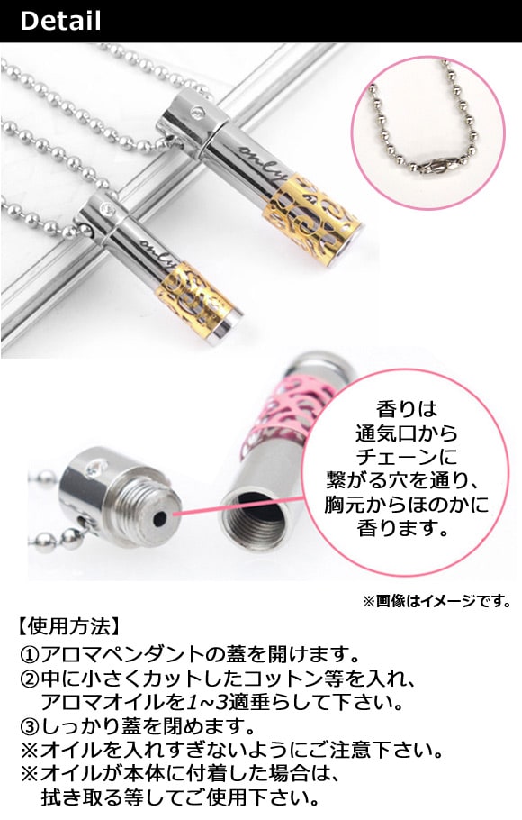 ペンダントトップに入れたアロマオイルが、胸元の体温で温められることでほのかに香ります。