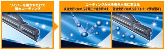 新開発の特殊ラバーにより、ワイパーを作動させることで、シリコンオイルがガラス面に付着し、撥水被膜をスピード形成します。(※撥水被膜の形成には、ワイパーを乾拭き状態で作動させて下さい。)