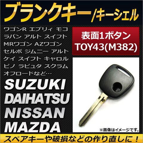 スペアキー キーレスカバー 鍵 キー カギ スペア スペアー キーレス 合鍵 リモコンキー リペアキー SUZUKI DAIHATSU NISSAN 日産 MAZDA 1ボタン式 ワンボタン TOY43ブレード M382ブレード ワゴンR エブリィ モコ ラパン MRワゴン AZワゴン セルボ ジムニー アルト ケイ スイフト キャロル ピノ ラピュタ スクラム オフロード カバー スイッチ ボタン 交換 ブランク シェル シエル 純正互換 社外品 外溝 修復 破損 紛失 なくす 予備 キーレスエントリー 送信機 リモコン 汎用 互換品 互換