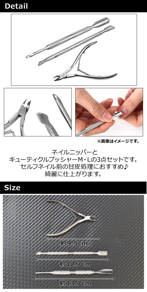 ネイルニッパーとキューティクルプッシャーの便利な3点セットです。