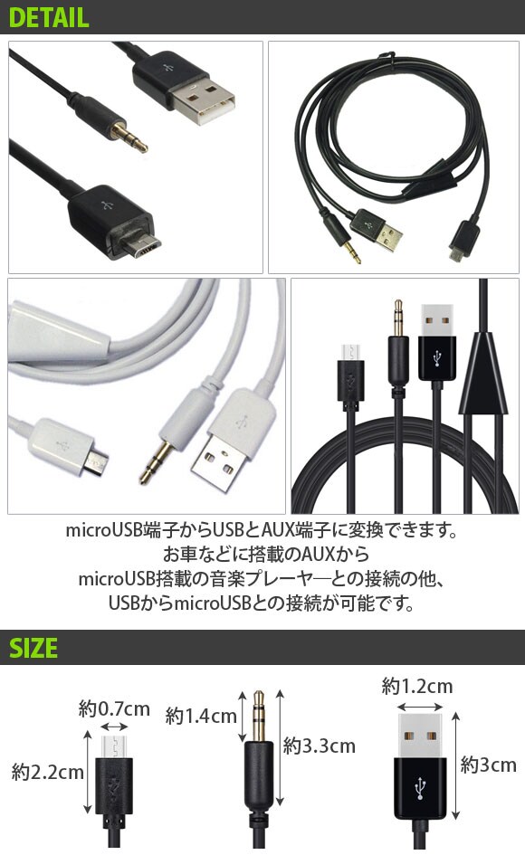 microUSB変換ケーブル 約1m お車に搭載されているAUXとお使いの音楽プレーヤーを接続! 選べる2カラー AP-UJ0413