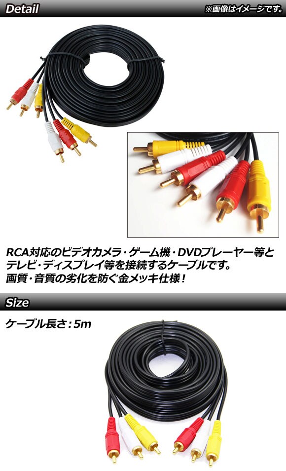 RCA映像ケーブル RCAビデオケーブル 延長ケーブル 映像ケーブル ビデオケーブル 接続ケーブル コンポジットケーブル AVケーブル ピンプラグ RCA オーディオ端子 コンポジット映像信号 映像信号 ステレオ 音声 音楽 音 曲 ミュージック 機器 CD MD コンポ ポータブル スピーカー DVDプレイヤー HDレコーダー テレビ TV PC パソコン 周辺機器 ゲーム機 デジタル家電 入力 出力 データ 映像 オーディオ ビデオ AV デジタル接続 レコードプレイヤー 赤 白 黄色 金 ゴールド オス端子 5メートル