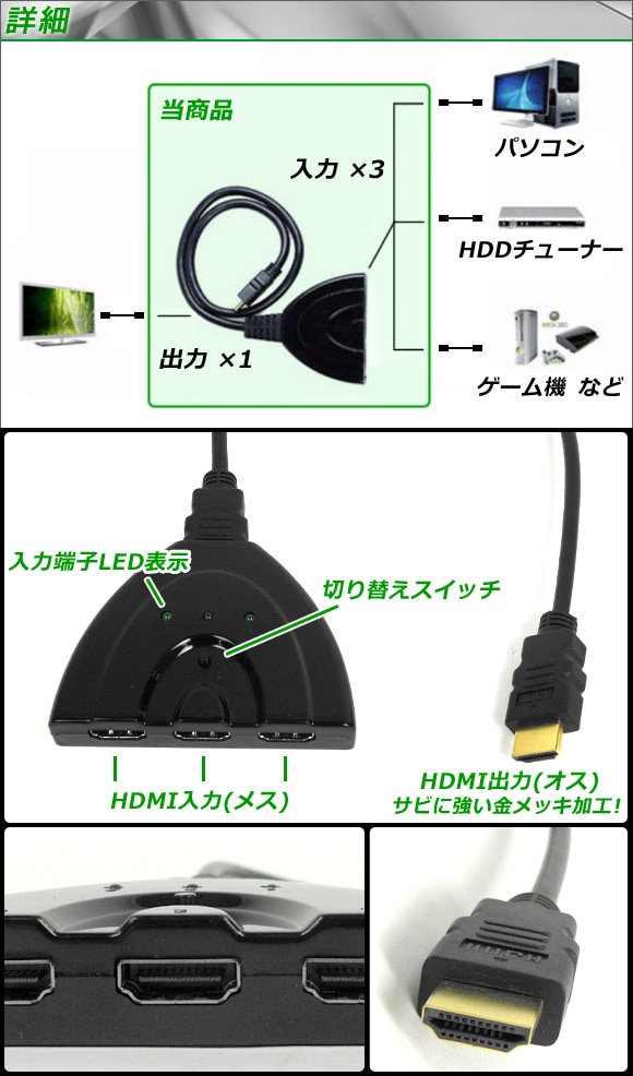 HDMI 分配器 切替器 セレクター 変換アダプタ 切り替え 切替 分配 分岐 変換 延長 アダプター アダプタ ケーブル コネクタ プラグ スプリッタ スプリッター ポート 映像 ディスプレイ モニタ 3入力 1出力 3切替 3ポート 3D フルHD FULL HD ハイビジョン 1080p 高精細 高画質 金メッキ レコーダー ハードディスク HDD パソコン DVD AVアクセサリ デジタル オーディオ ビデオ ノート PC ゲーム機 テレビ TV SKT-STB チューナー 周辺機器 AC機器 機器 機材 便利 グッズ 用品