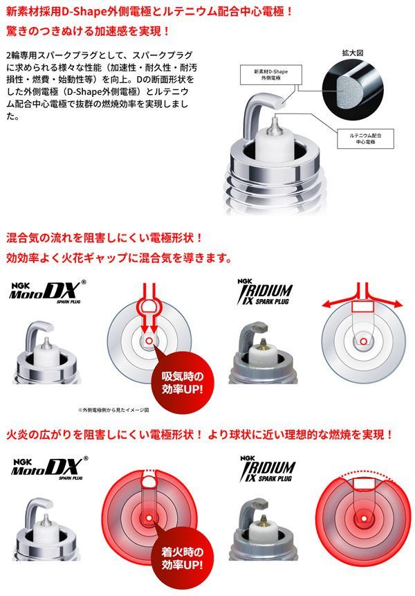 2輪専用スパークプラグとして、スパークプラグに求められる様々な性能(加速性・耐久性・耐汚損性・燃費・始動性等)を向上。Dの断面形状をした外側電極(D-Shape外側電極)とルテニウム配合中心電極で抜群の燃焼効率を実現しました。
