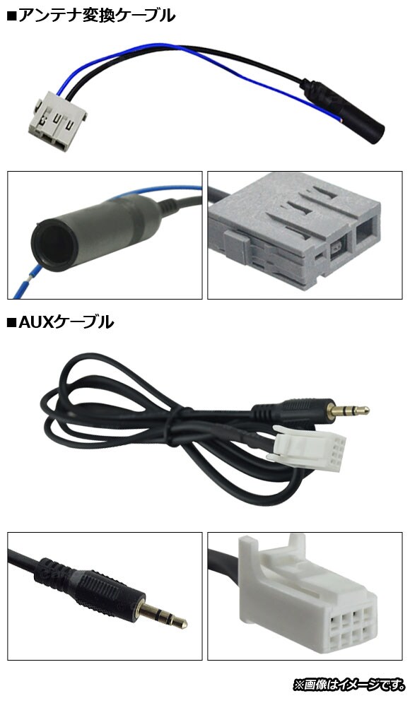 バックカメラ変換ケーブル、オーディオハーネス、アンテナ変換ケーブル、AUXケーブルのセットです。